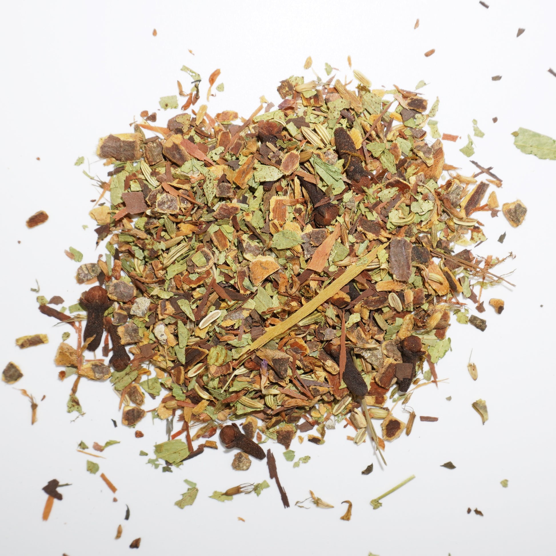 Cascara Sagrada, Senna, Pau D'Arco, Red Clover, Clove, Fennel, Cinnamon.